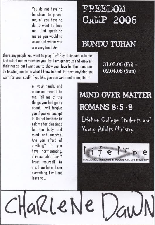 Last weekend I went to Bundu Tuhan for Freedom Camp 2006. The camp was organized by the Lifeline SHC Ministry for all the Catholic youths. The theme of the camp is Mind over matter and the speaker is Jude Antoine. What a great speaker he is *tho every words comes from God* (^_^) ... He makes the Holy Bible so alive.